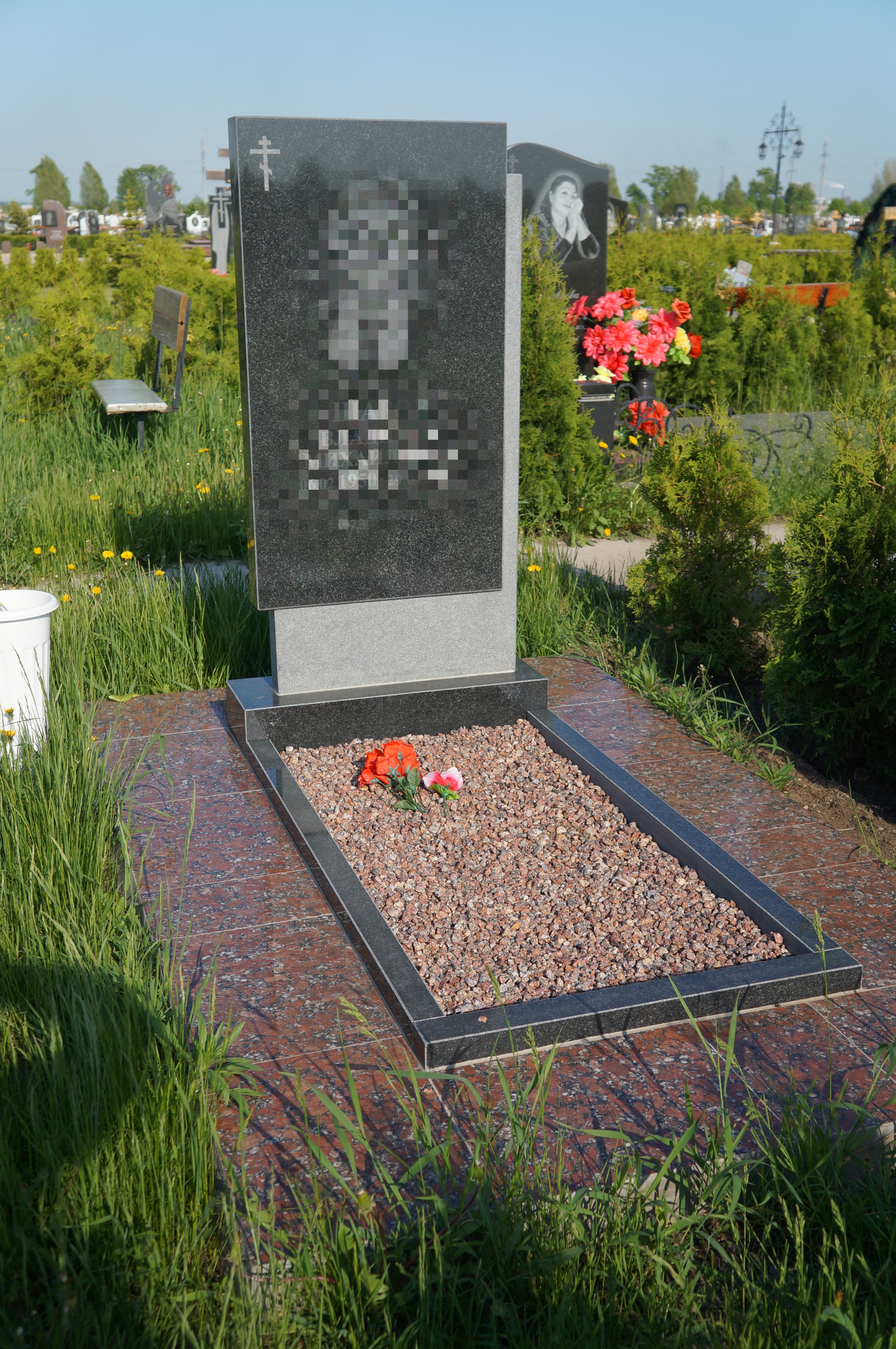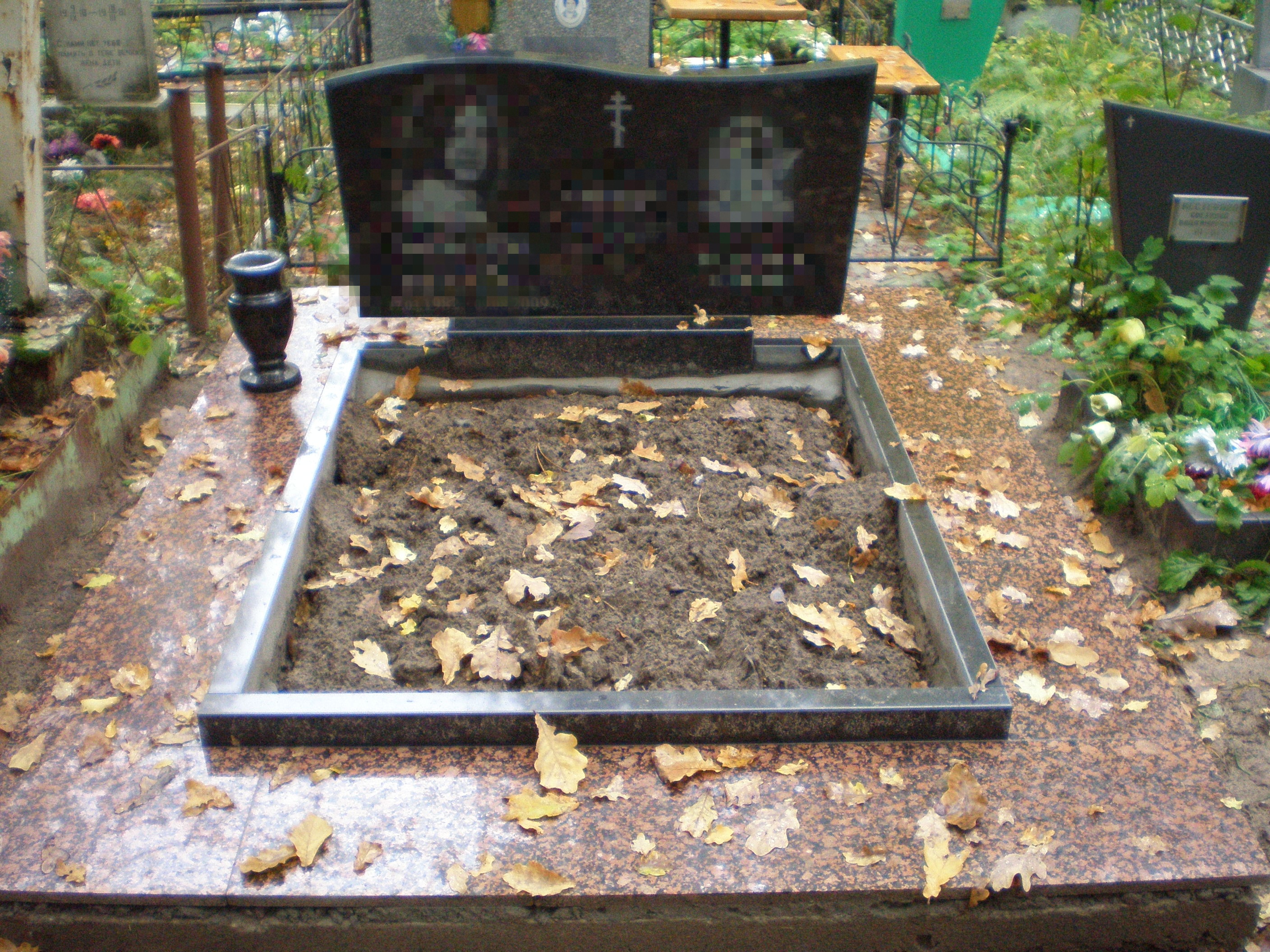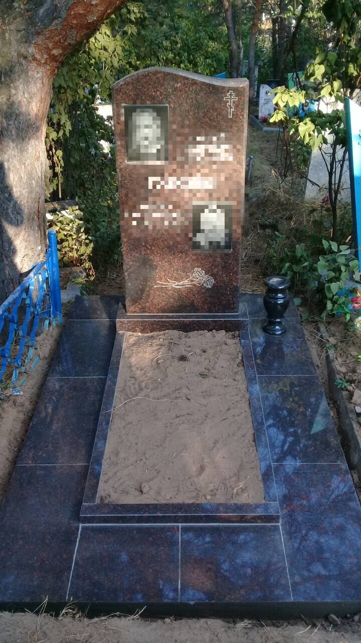 Установки памятника и цветника иногда бывает недостаточно — оформление цоколя могилы плиткой из гранита или мрамора помогает придать месту захоронения законченный аккуратный вид. Такая облицовка: